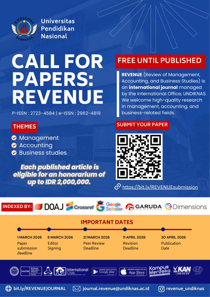 Undiknas University is dedicated to fostering national development and global outreach, epitomized by its tagline “Techno-research-preneur University.” Rooted in this commitment, Undiknas University enthusiastically embraces collaborative opportunities with researchers worldwide, particularly in the realms of business, law, social sciences, digital innovation, and engineering. Through these thematic research avenues, the university aims to make impactful contributions to both academia and society at large. For more information and document submission, please contact us through our email: journal.revenue@undiknas.ac.id or +62821-1915-0022 (IO Official WhatsApp)